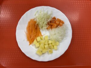 じゃがいもとにんじんのさいの目切り、人参とキャベツの千切り、玉ねぎのみじん切りを行いました。