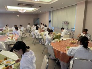 完成した料理を円卓にセッティングして、いつもとは違う雰囲気の中テーブルマナーも意識しながら、試食を行いました。
