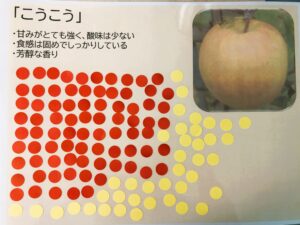 カットしたりんごを食べ比べていただき、どちらが好みかシールを貼って投票していただきました。