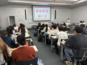 まずは蚕糸特産課の吉野様にお越しいただき、医療保健学部 栄養学科3年生に群馬県産果物の生産の状況や
