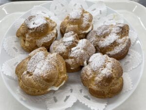 冷ましてから、中にカスタードと生クリームをはさみ、ダブルクリームシュークリームを食べて、楽しく小麦粉の膨化について学びました。