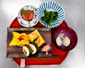 茶巾寿司、袱紗寿司、のり巻き、菜の花の辛子和え、はまぐりの潮汁、桜餅