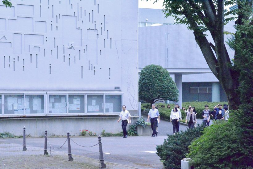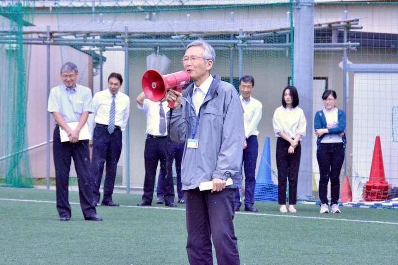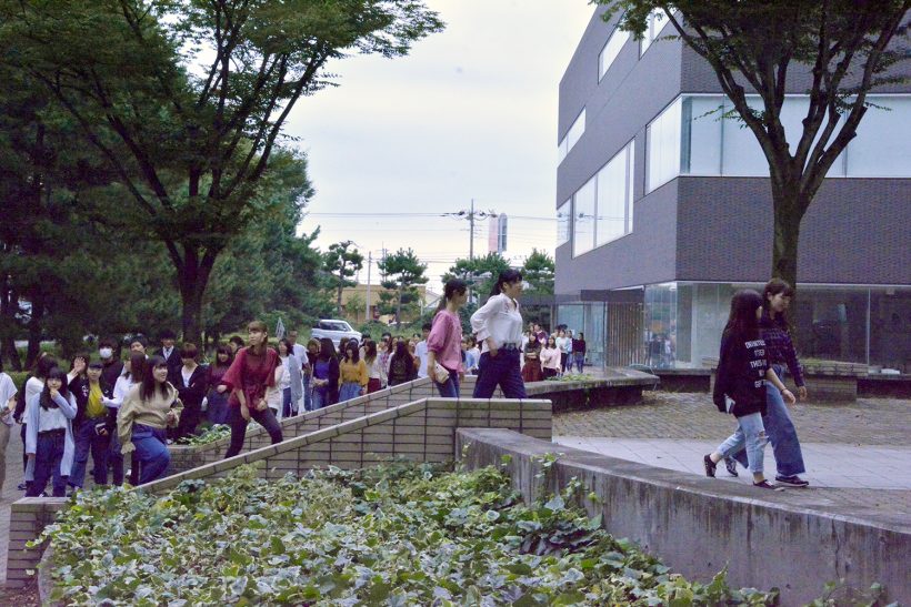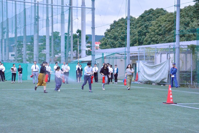 強い揺れの地震発生後、事務棟1階の給湯室から出火し、授業中の学生を避難させるという想定で訓練しました。