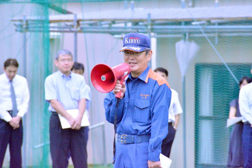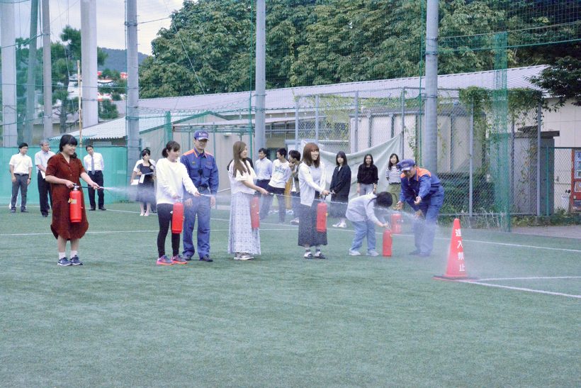 桐生みどり消防署の方から消化器の使い方を教わり、実際に初期消火訓練をしました。