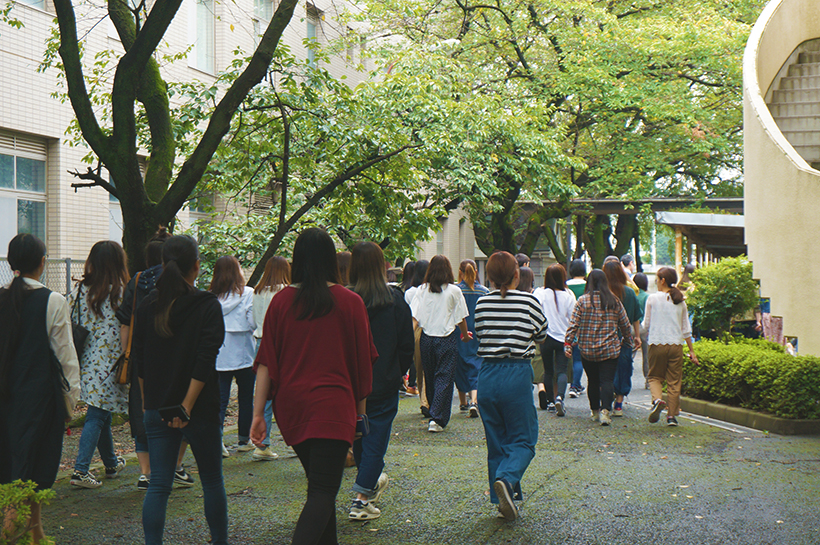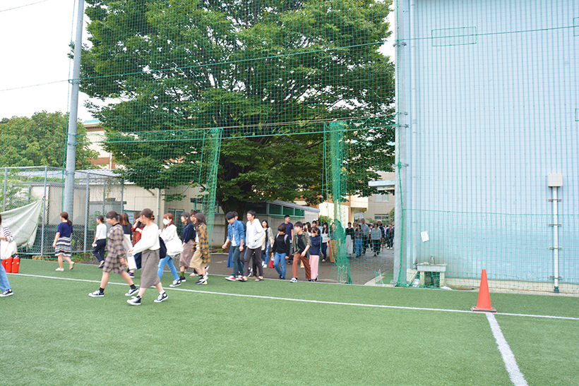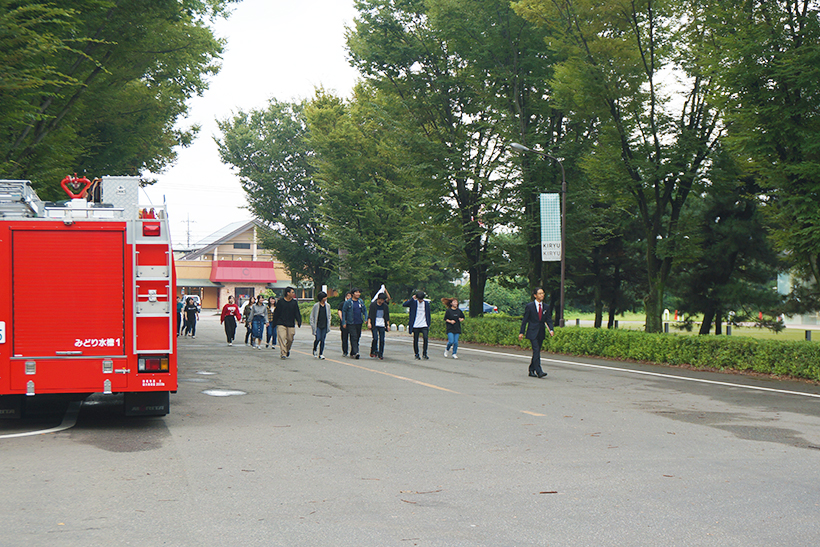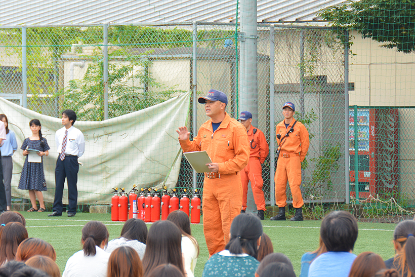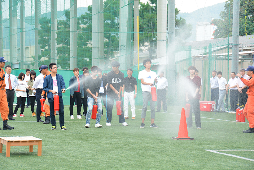 強い揺れの地震発生後、事務棟1階の給湯室から出火し、授業中の学生を避難させるという想定で訓練しました。
