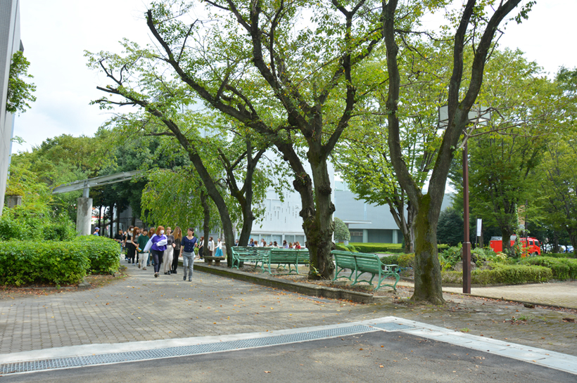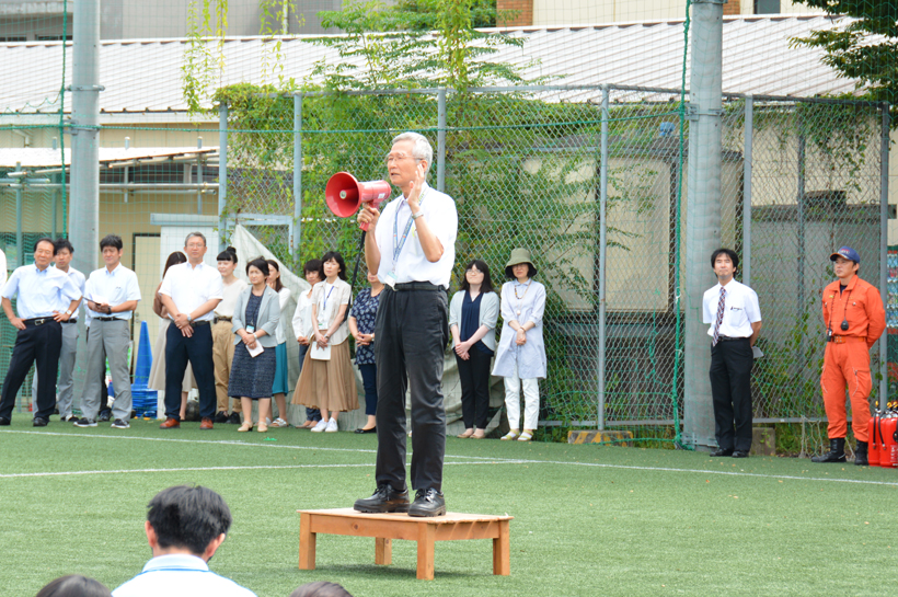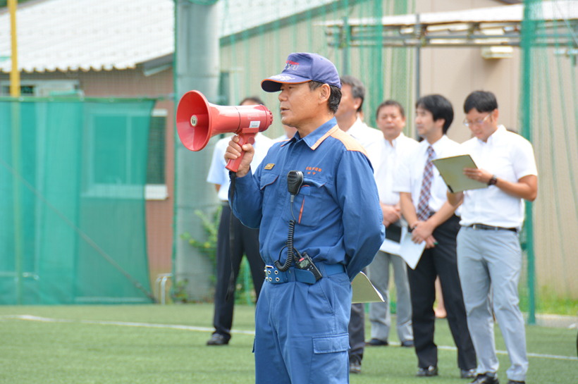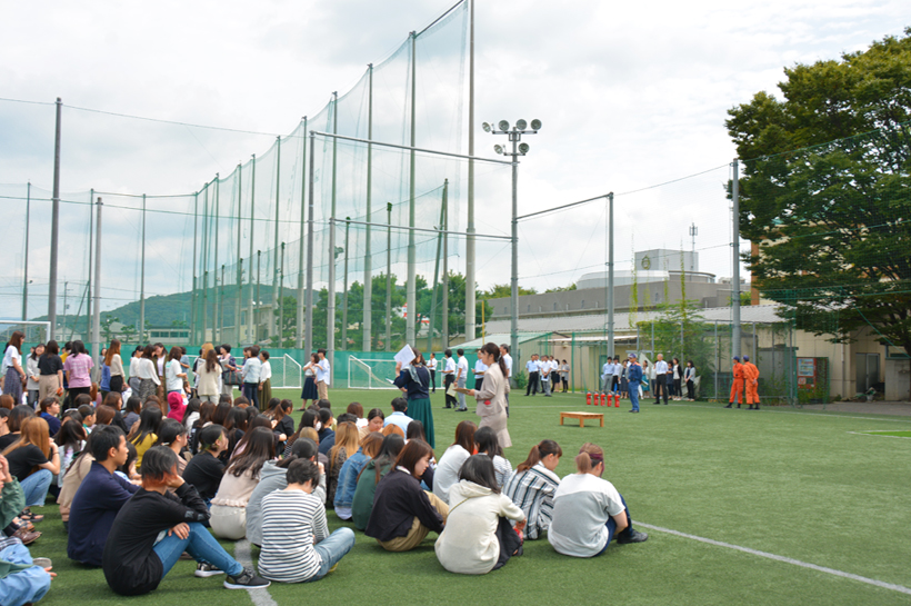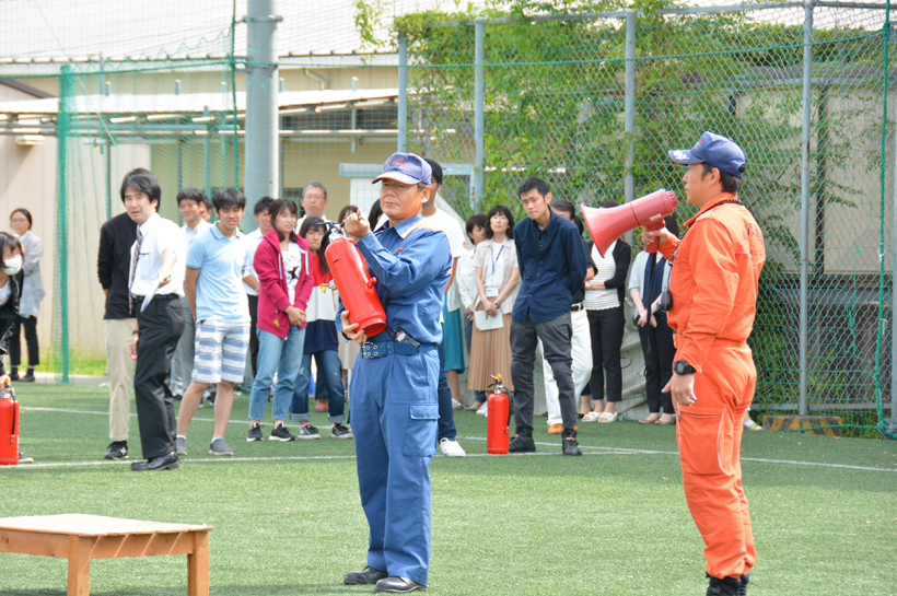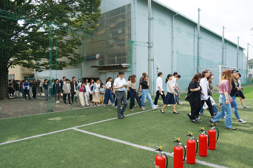 強い揺れの地震発生後、事務棟1階の給湯室から出火し、授業中の学生を避難させるという想定で訓練しました。