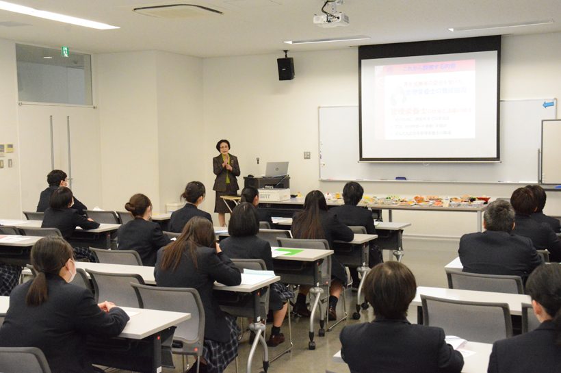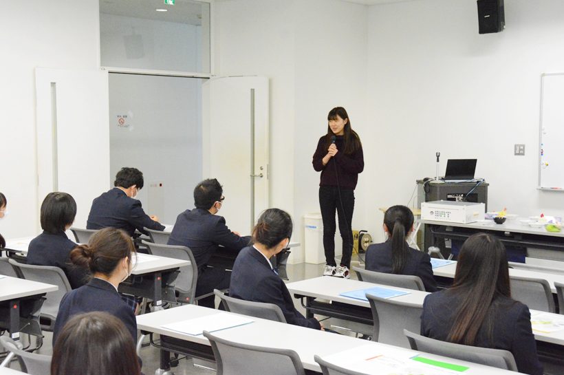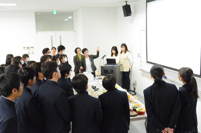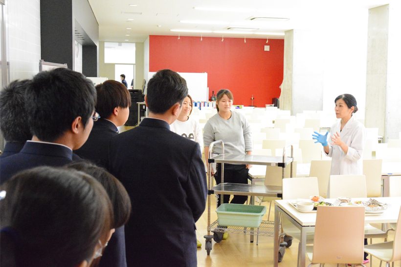 11月14日(木)、富岡実業高校の2年生が大学見学に来ました。今回は、医療保健学部 栄養学科の学科紹介、施設見学、授業体験をしてもらいました。