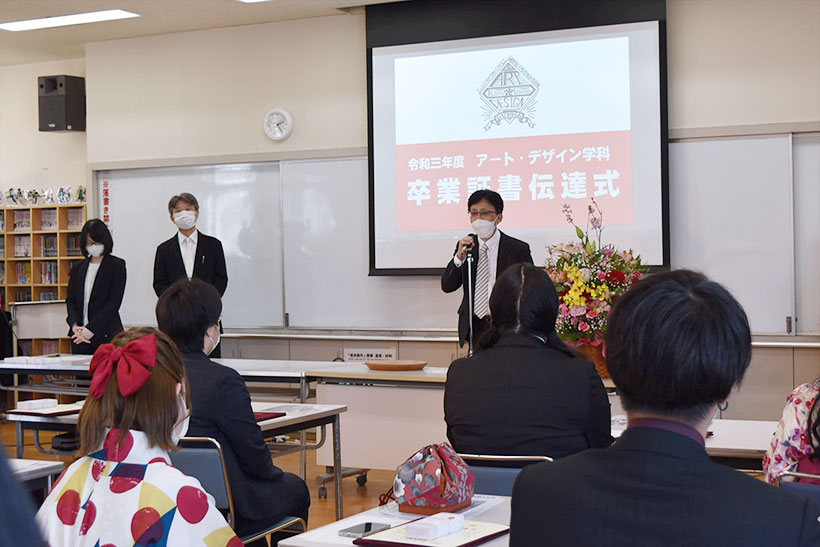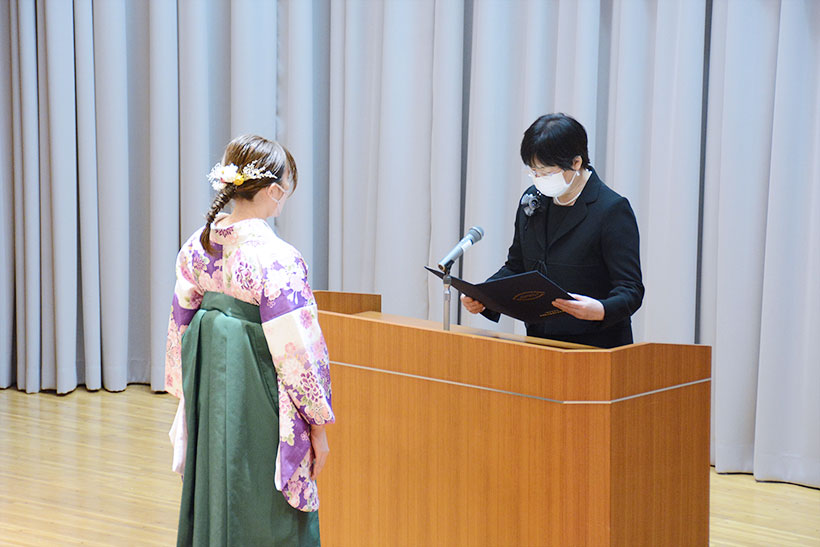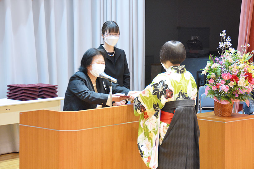 医療保健学部 看護学科75名、医療保健学部 栄養学科41名、生活科学科29名、短期大学部 アート・デザイン学科58名の卒業生へ学位記が授与され、別科助産専攻17名の修了生へ修了証書が授与されました。