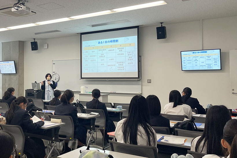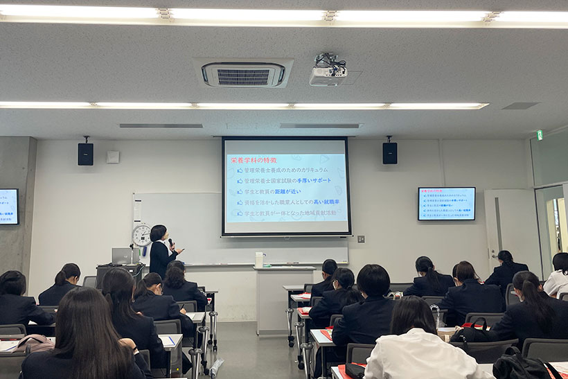 医療保健学部 栄養学科の教員による学科説明では、管理栄養士の資格や国家試験対策についてや、医療保健学部 栄養学科の学生の時間割についてなどの説明がありました。