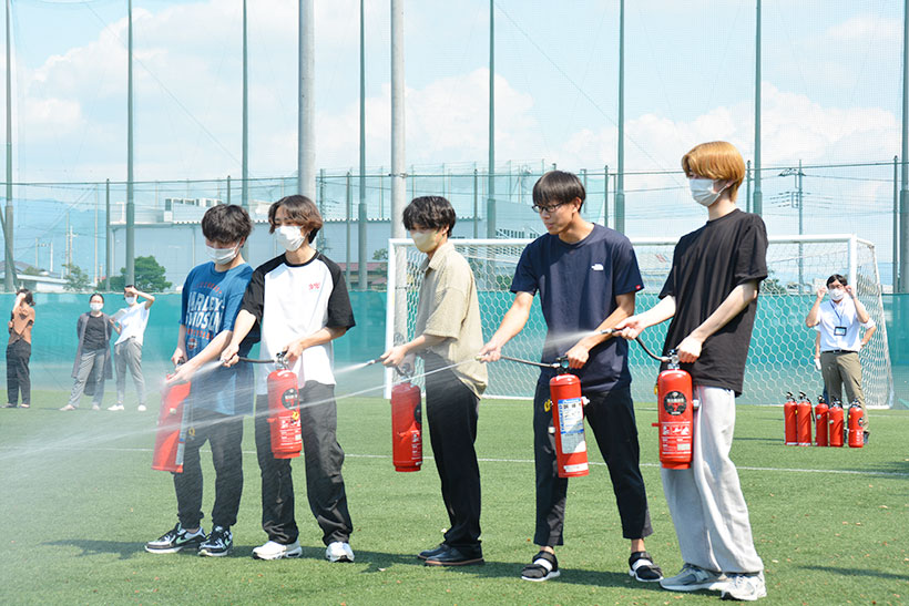 強い揺れの地震発生後、事務棟1階の給湯室から出火し、授業中の学生を避難させるという想定で訓練しました。