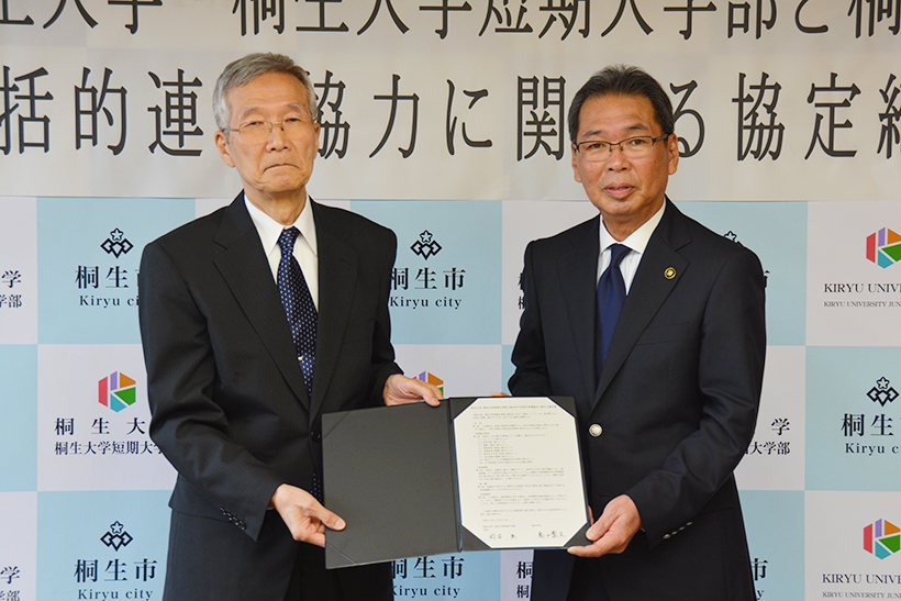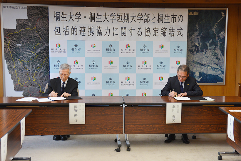 桐生市と本学が包括的な連携のもと、双方の資源を有効に活用しながら相互に協力し、大学と地域の活性化及び発展に寄与することを目的として、連携協力することとなりました。