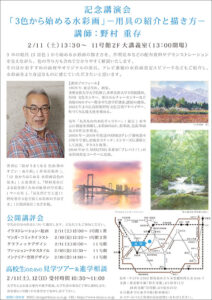 記念講演会では、「3色から始める水彩画」-用具の紹介と描き方- というテーマで、野村 重存 氏が講演されます。