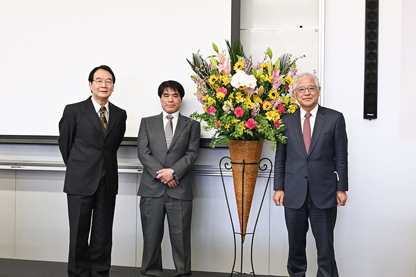 左から、山﨑 学長、榮 先生、山科 副学長