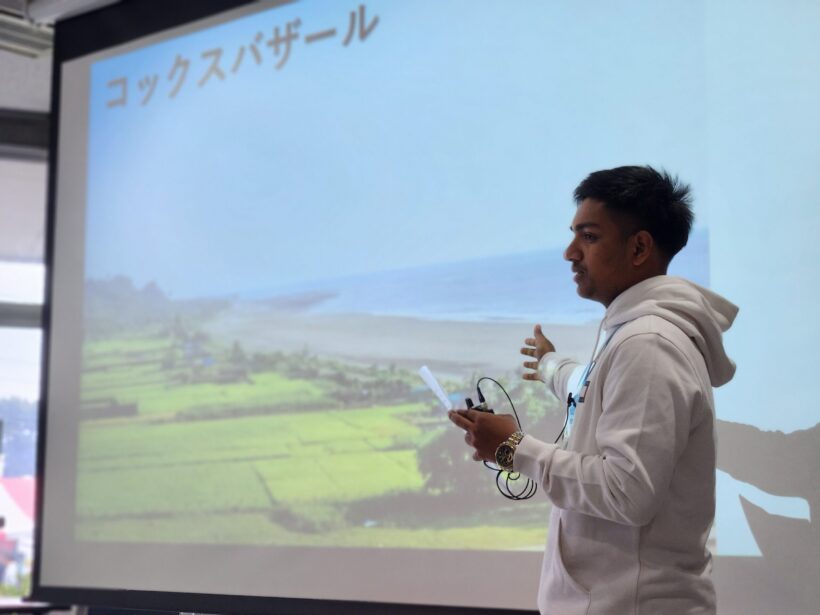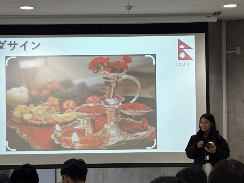 インドネシア、ネパール、バングラデシュ出身の留学生によるプレゼンテーションが行われ、それぞれの国の文化、出身地、食文化、生活習慣などが紹介されました。参加学生は各国の文化について理解を深めるとともに、その後の自由交流の時間では本学の学生と留学生の間で活発で友好的な意見交換が行われました。