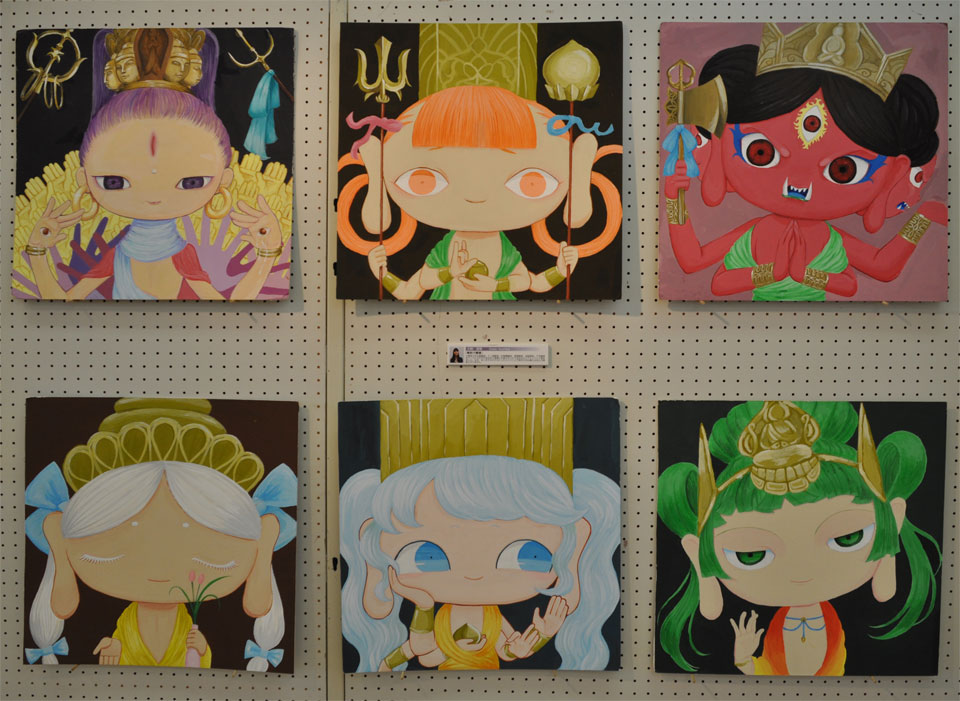 六観音である聖観音、十一面観音、如意輪観音、馬頭観音、准胝観音、千手観音をベースにそれぞれ色をあて表情にも変化をつけて自分なりにアレンジして描きました。なお、あくまでもモデルにしたということで実在する仏尊とはなんら関係ございません。