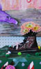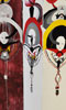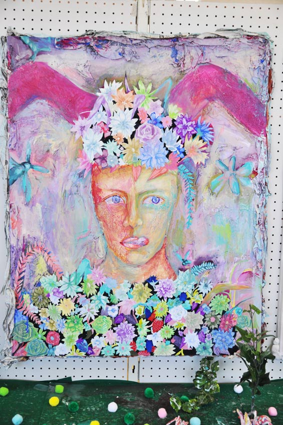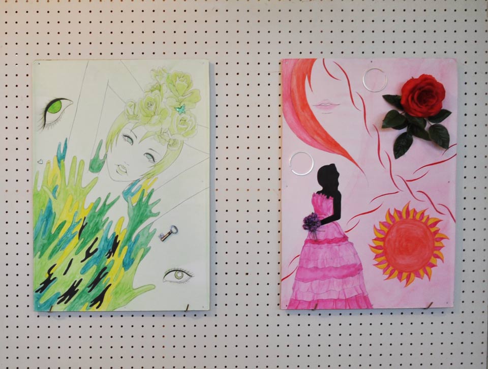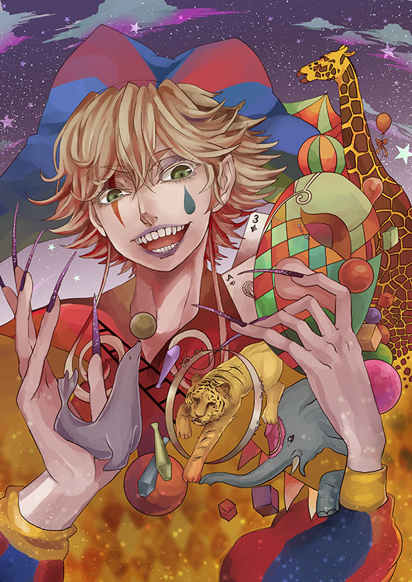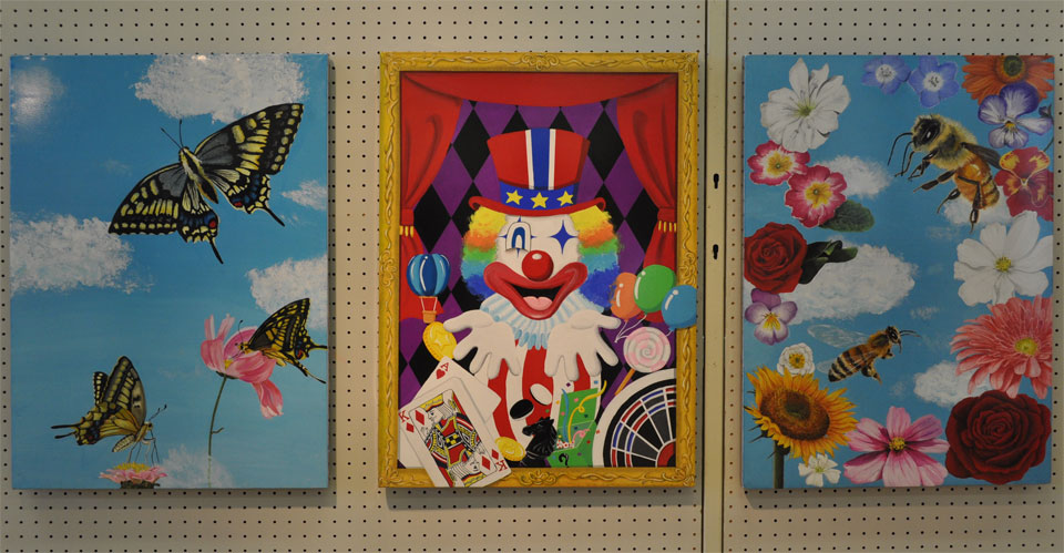『花畑』は季節色とりどり花を1つ1つリアルに描き、そこに蜂を描き加える事で全体のイメージ、雰囲気をまとまらせた。一方『ピエロ』は花畑とは全く異なった世界観をだすためにあえてリアルさを抑えて描いた。