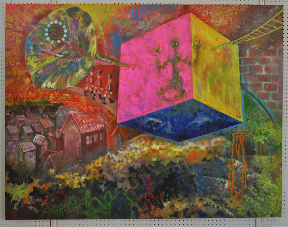 多次元世界をテーマに制作しました。多数の辺と面から成る立方体に多次元的なイメージをもったので、絵のモチーフとして取り入れています。いろいろな角度から見た不思議な世界の広がりを感じていただけたら幸いです。
