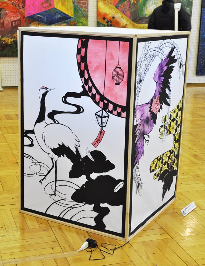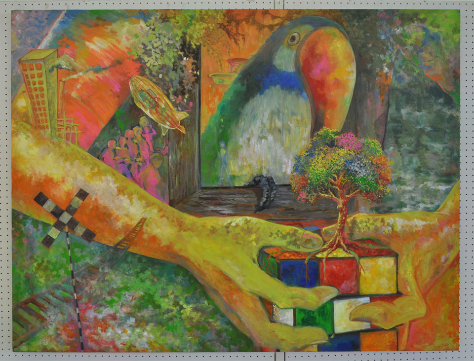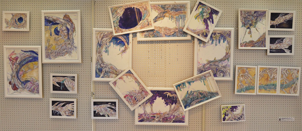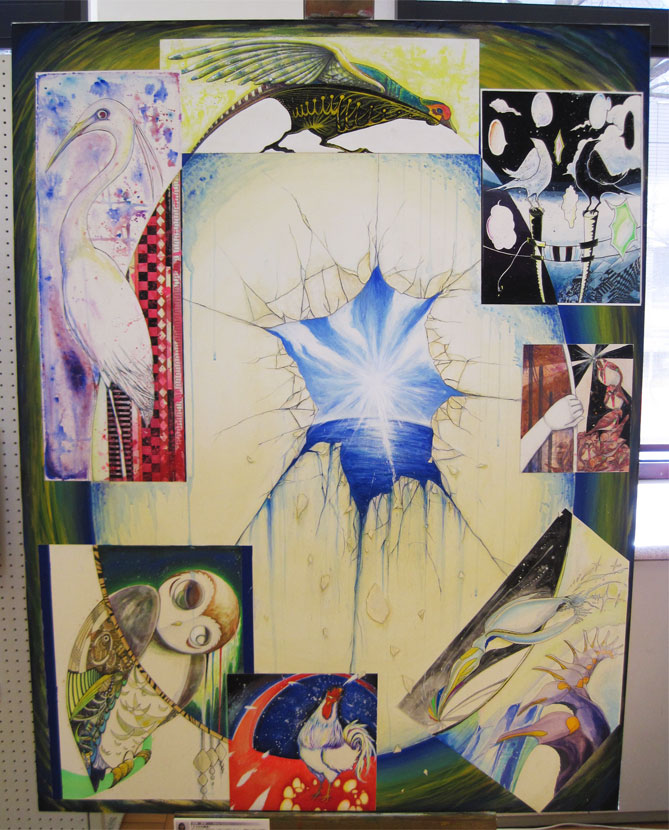 様々な色や形、習性を持った鳥を人の個性に見立てて一種類ずつ独特の世界観を描きました。そんな数々の個性が混在した世界の中で新たに生まれる物は何なのか。それを考えてこの作品を制作しました。