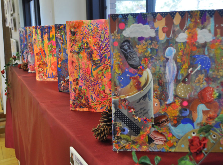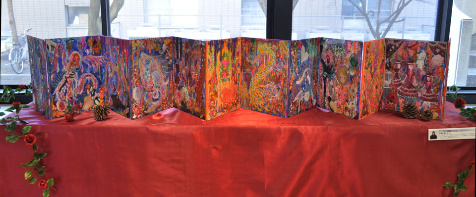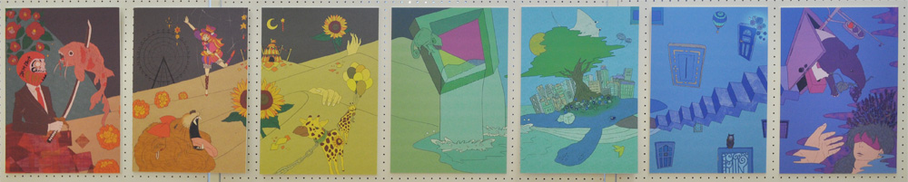 誰かが見た夢を漂っているというイメージで制作しました。夢が混ざり合って溶け出している感じを絵の具の厚みやコラージュで表現し、小さな作品を繋げることで絵本のような雰囲気に仕上げました。