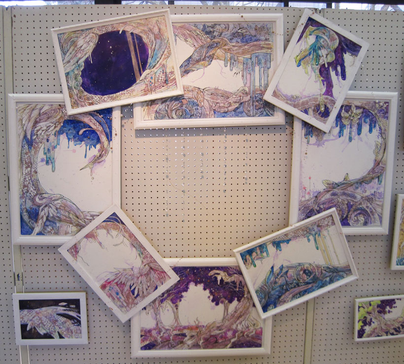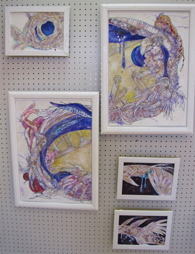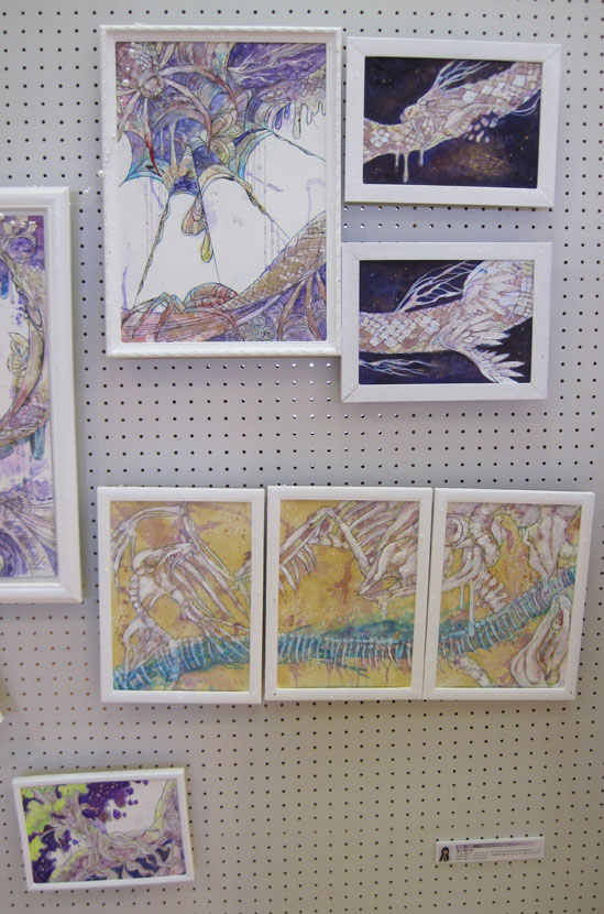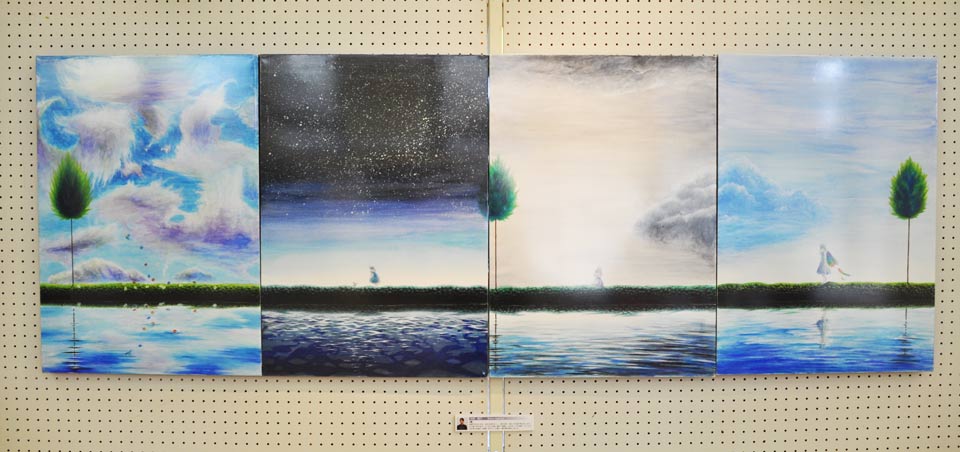 自分の好きな色の青、黒、赤、緑をそれぞれ自分の思うイメージで描きました。青は爽やかで冷たい、黒は悲しく切ない、赤は華やかで豪華、緑は不思議で捕らわれない…といった風に一つ一つにもテーマがあります。