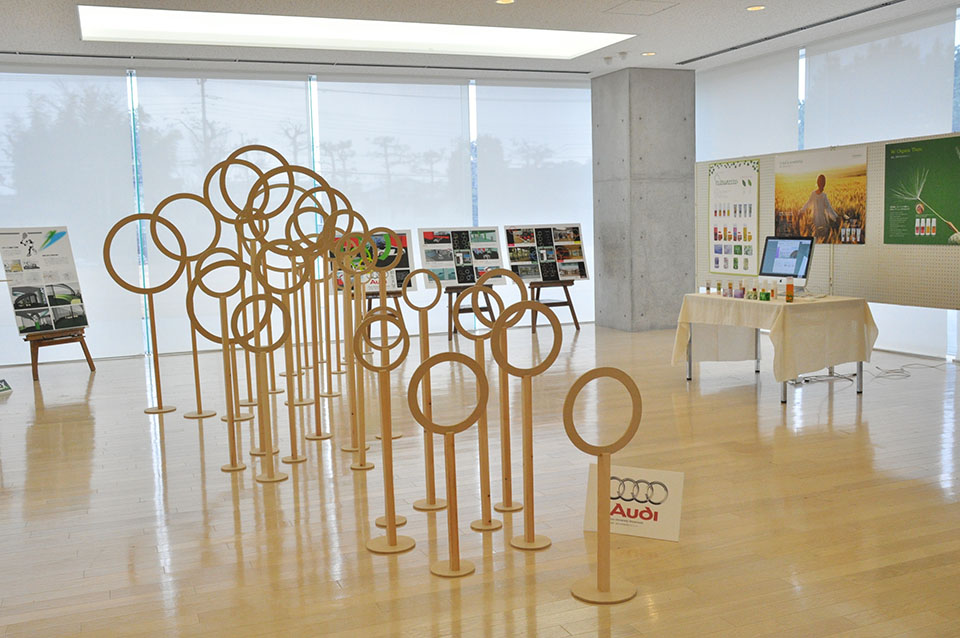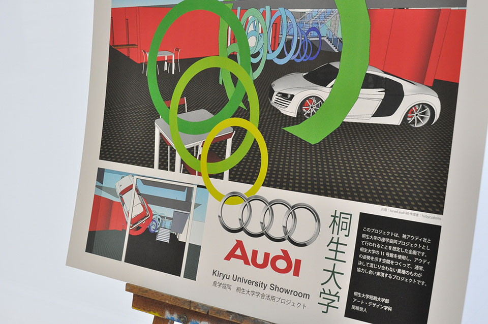 この企画は独audi 社と桐生大学がコラボするものです。決して混じり合わないもの同士がコラボし、大学の空間を使用してaudi の世界観を表現します。6 つのブースに分け身近な場所でaudi という非日常的なものを知り体感してもらうものです。