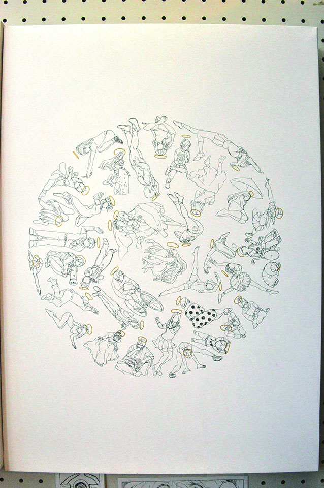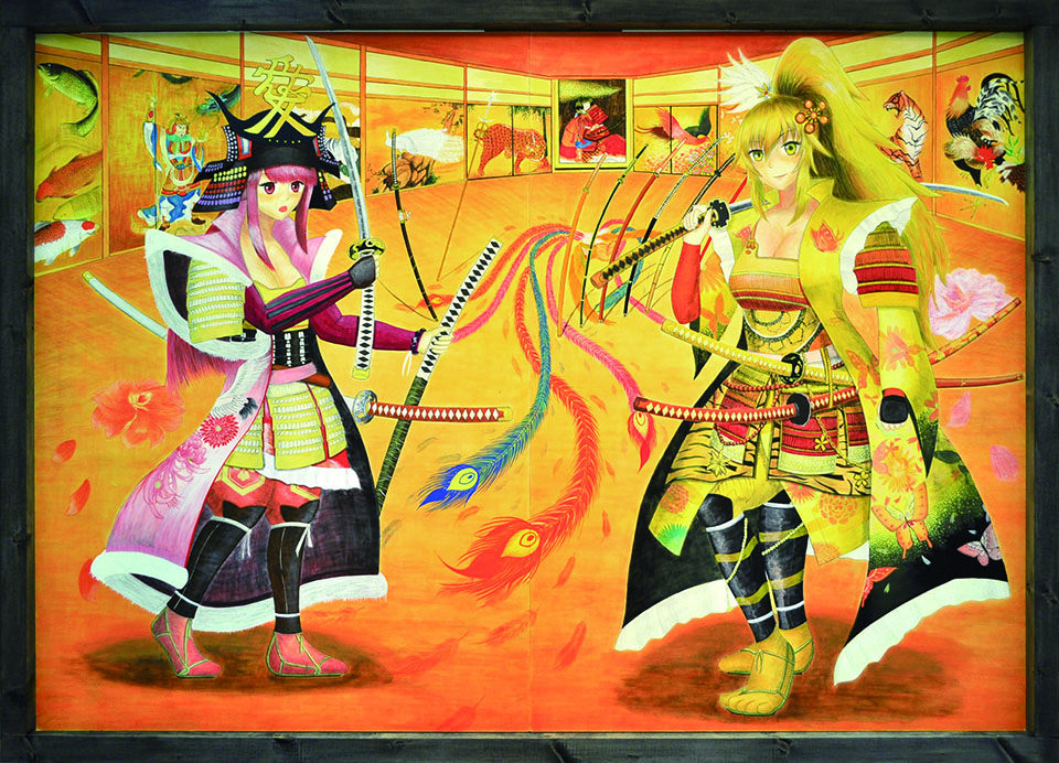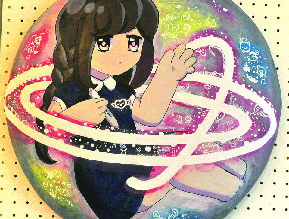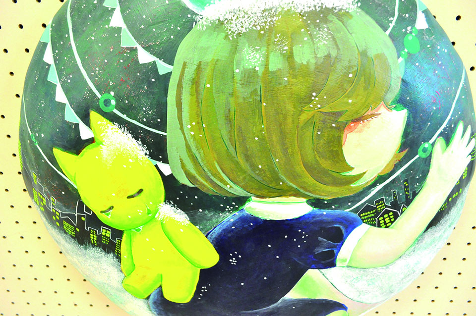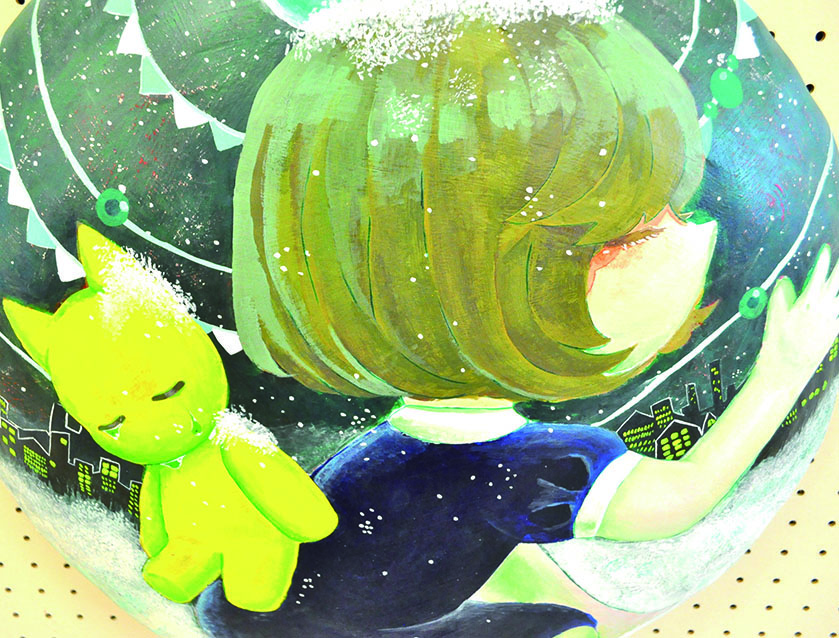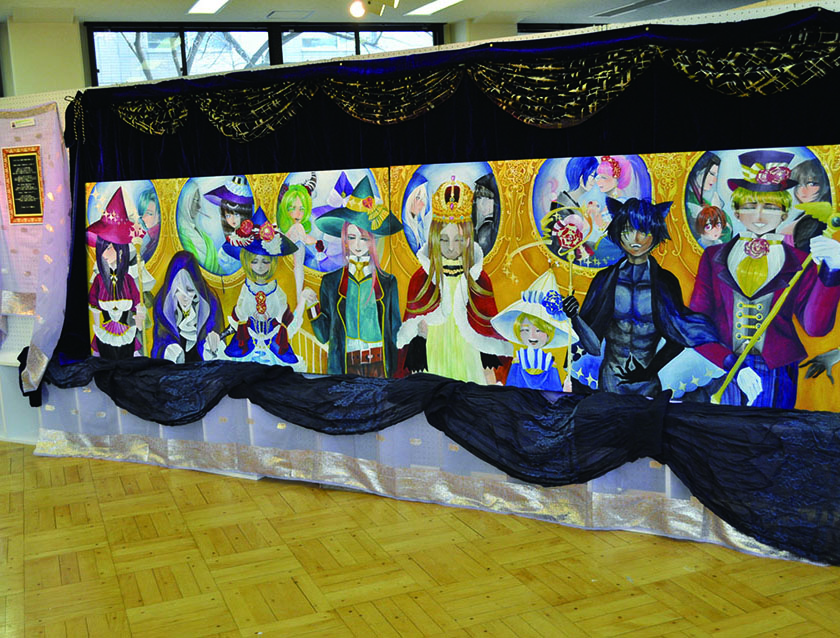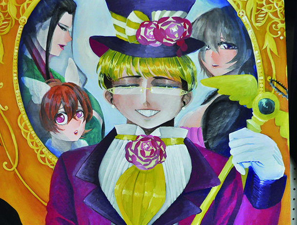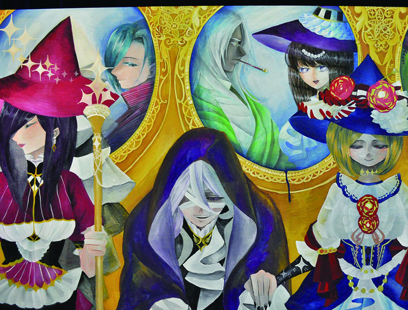 総大成とし自分の創作世界の主要人物を中心に描きました。黄金の球体に包まれ 独自の世界で生きる彼らを、永久の幸せを願い魔法使い達がそれらを守る様にし て囲っている様子を表現しました。
