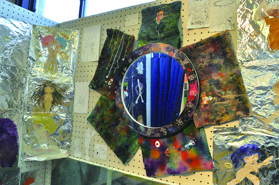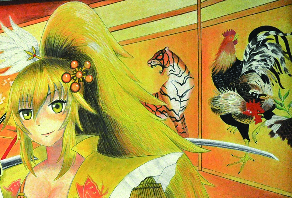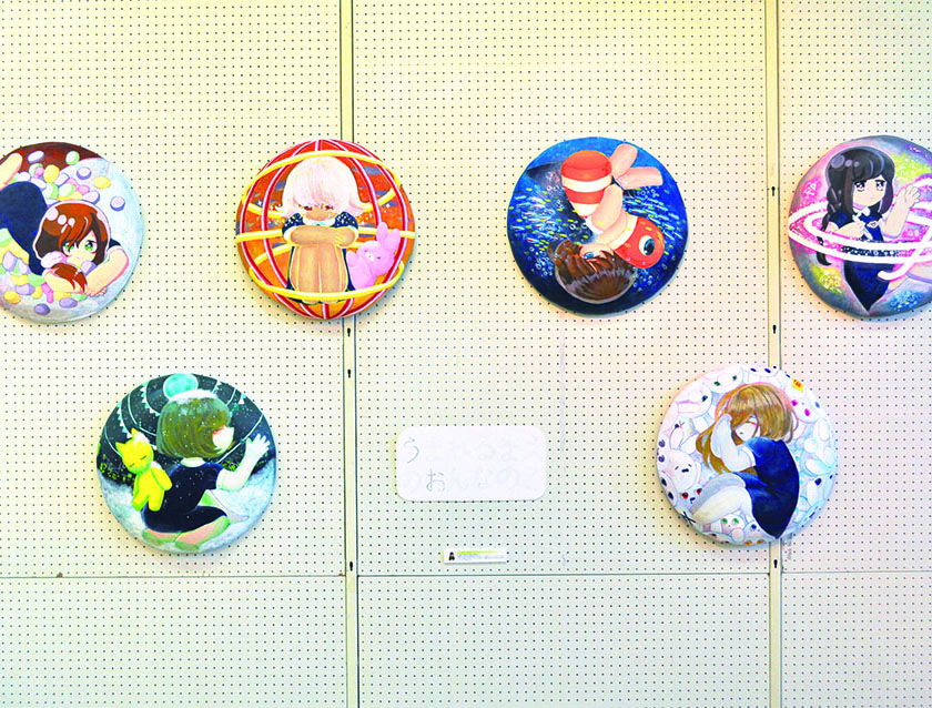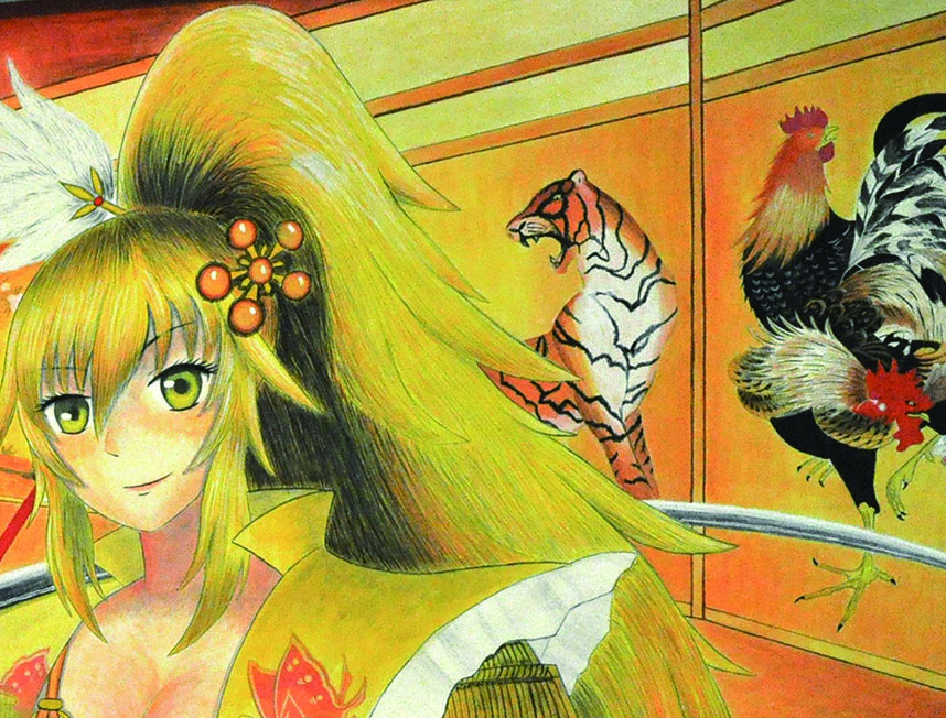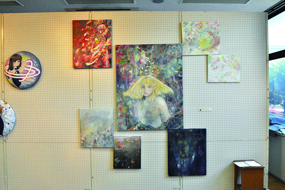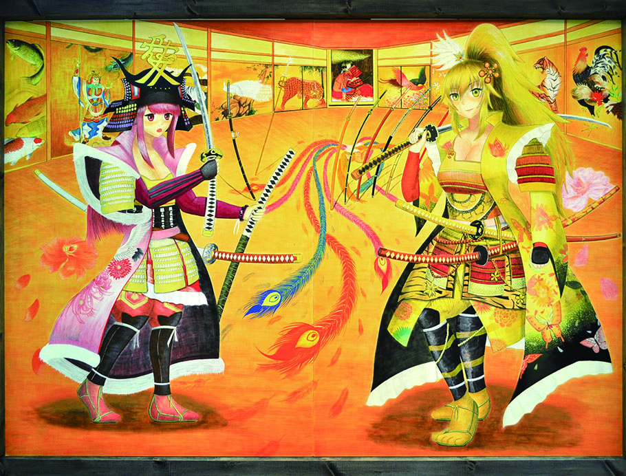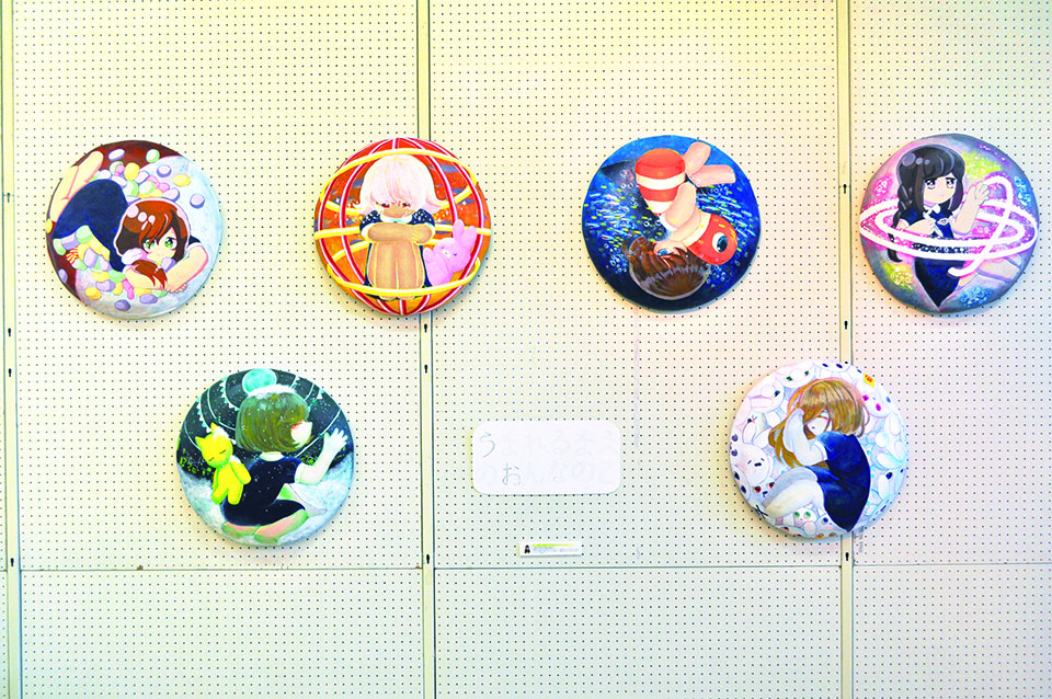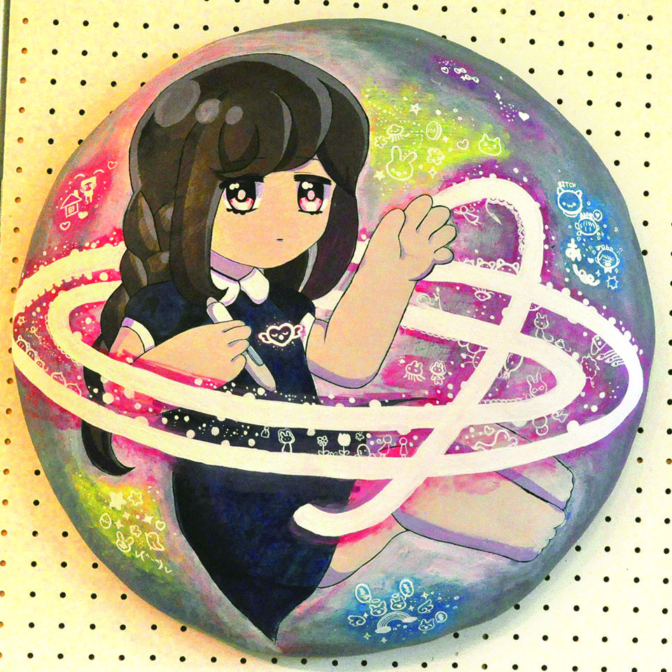 総大成とし自分の創作世界の主要人物を中心に描きました。黄金の球体に包まれ 独自の世界で生きる彼らを、永久の幸せを願い魔法使い達がそれらを守る様にし て囲っている様子を表現しました。