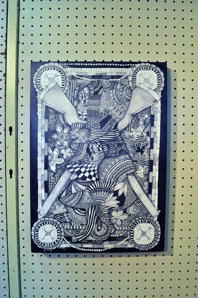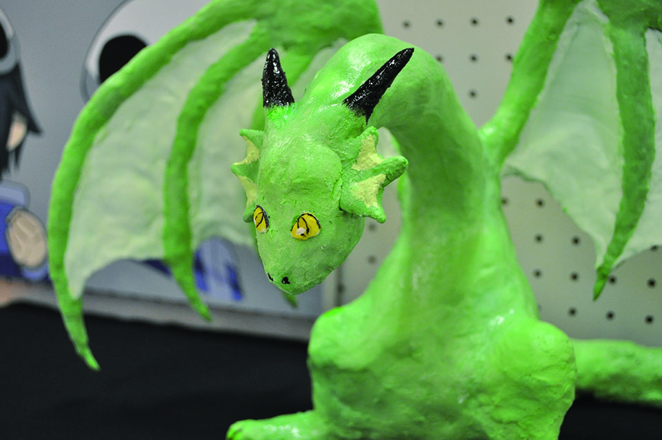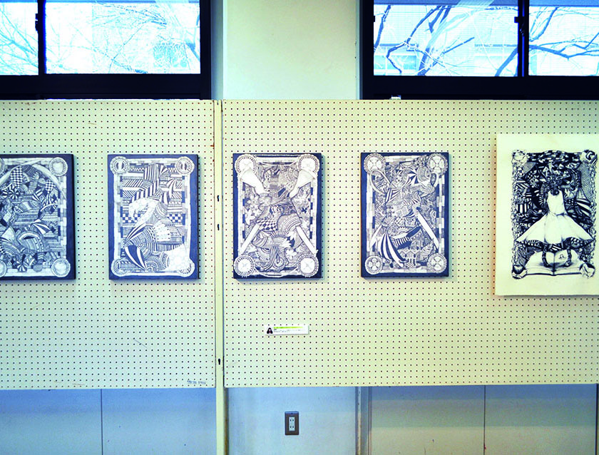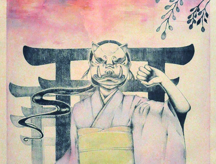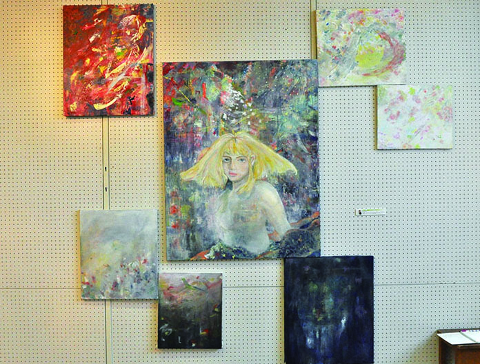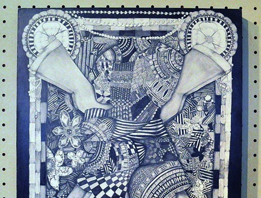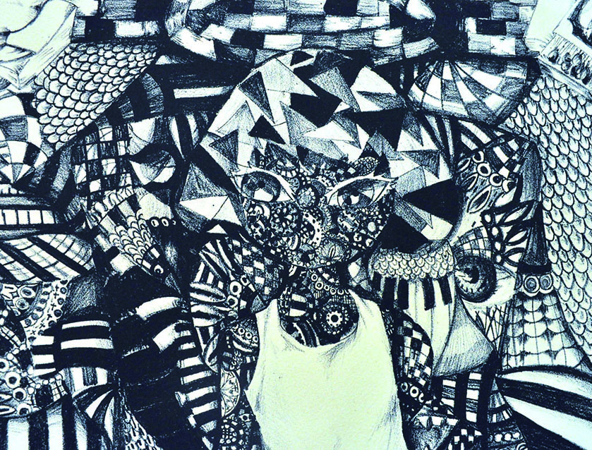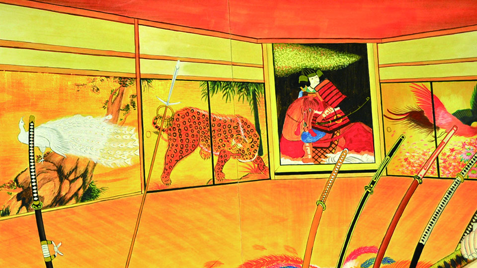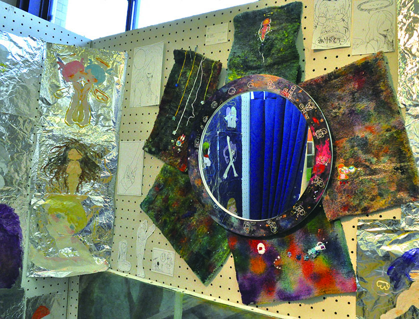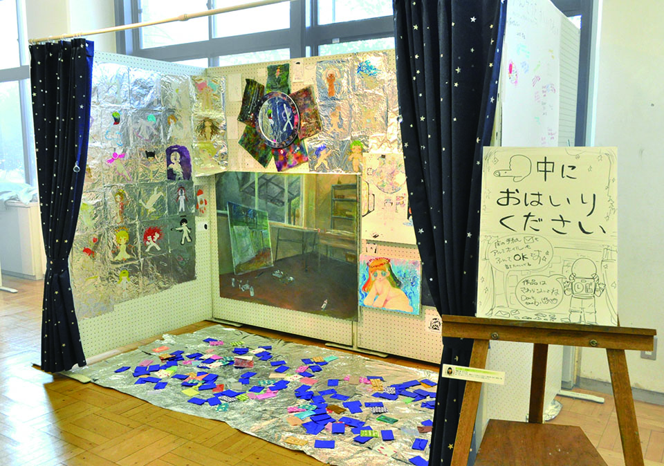 総大成とし自分の創作世界の主要人物を中心に描きました。黄金の球体に包まれ 独自の世界で生きる彼らを、永久の幸せを願い魔法使い達がそれらを守る様にし て囲っている様子を表現しました。