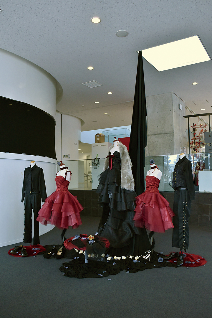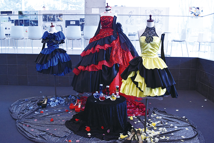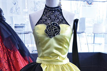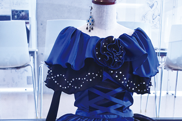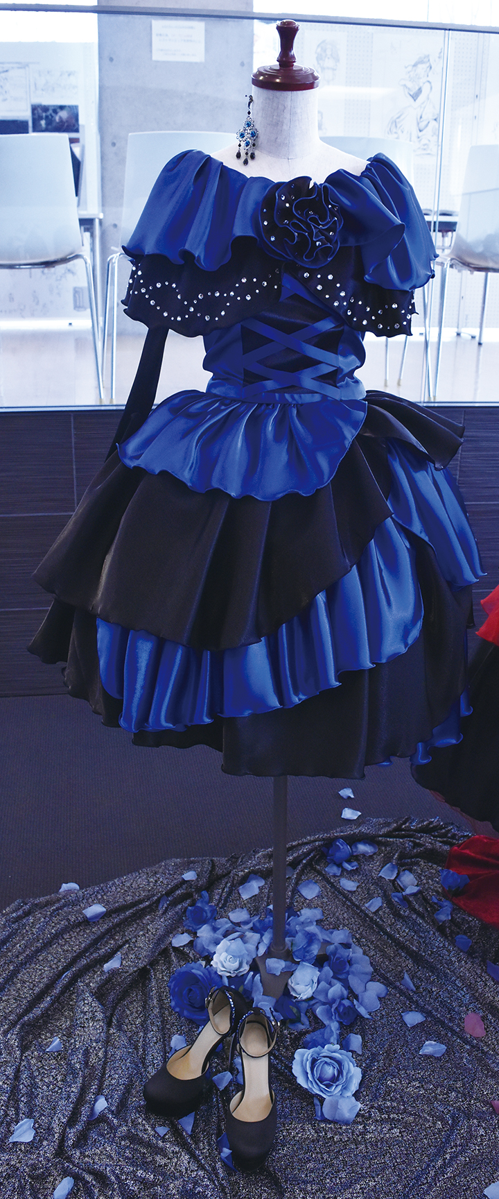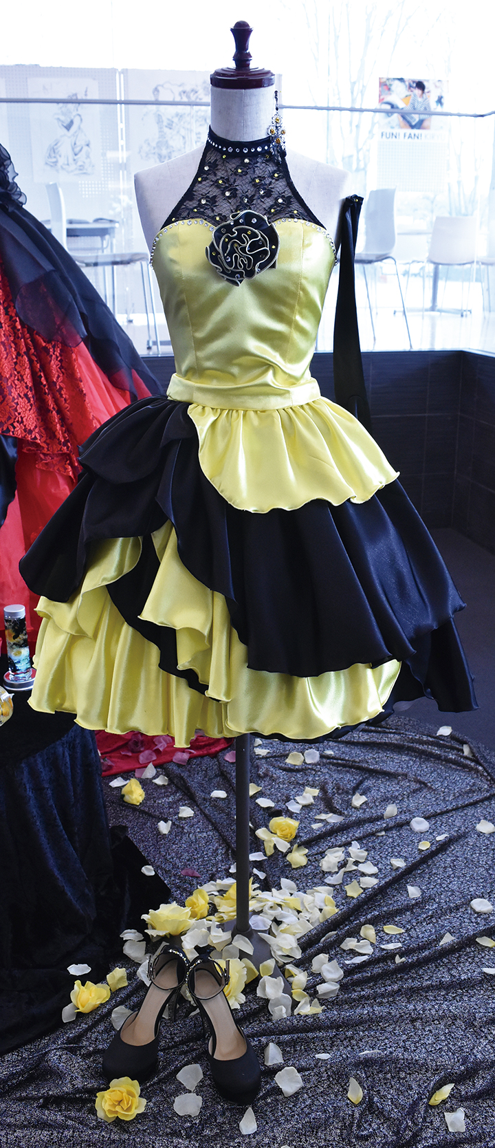 バラは豪華で高貴なイメージがあります。そのイメージをこのドレスに表現したいと思い制作しました。ドレスの裾に巻きロックをかけることでバラの花びらを、生地を何段にも重ねることでバラの豪華さを、光沢のある生地を使うことで高貴さを表現しました。