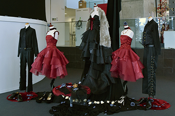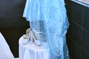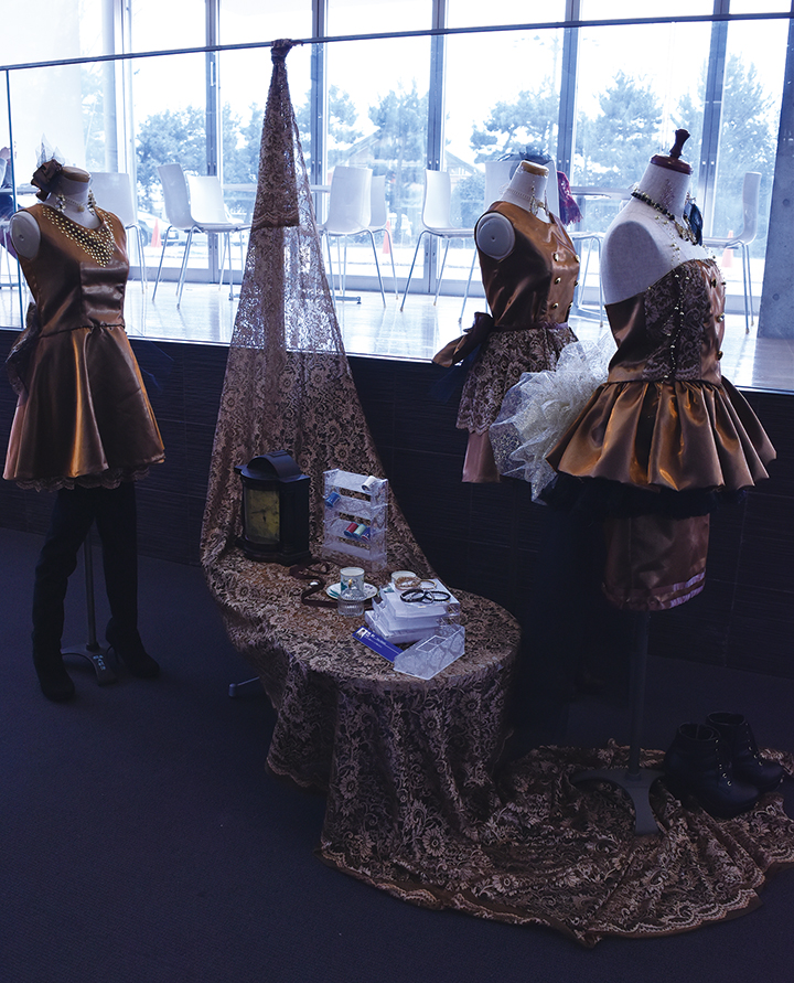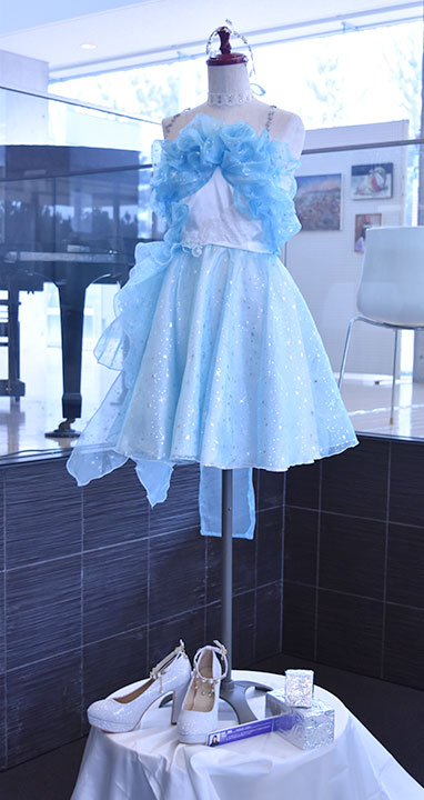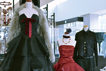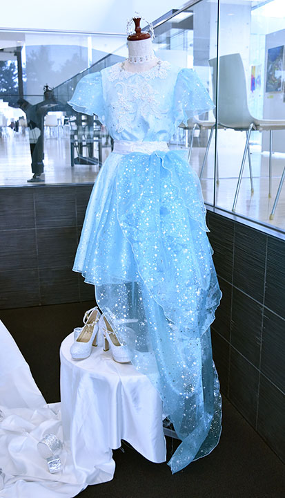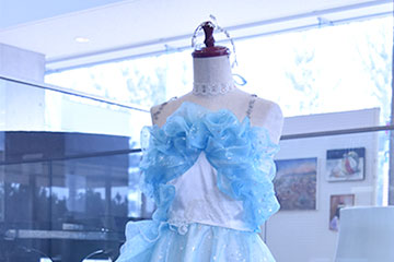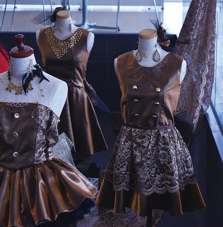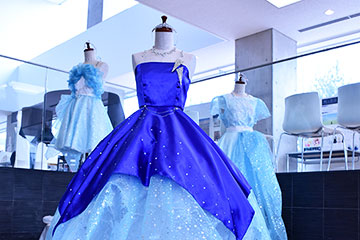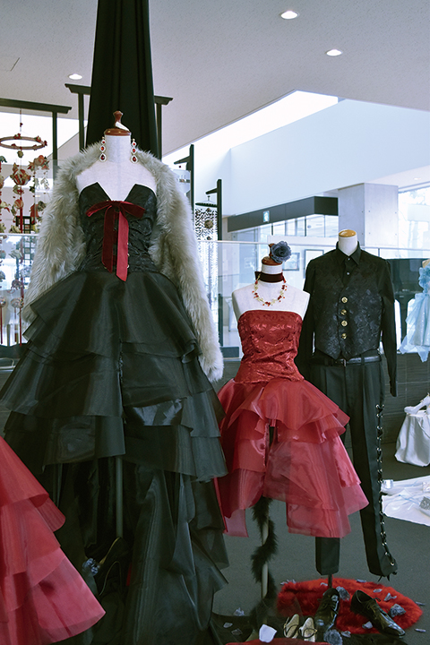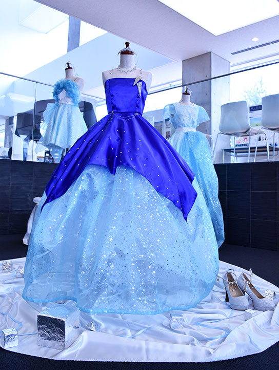 バラは豪華で高貴なイメージがあります。そのイメージをこのドレスに表現したいと思い制作しました。ドレスの裾に巻きロックをかけることでバラの花びらを、生地を何段にも重ねることでバラの豪華さを、光沢のある生地を使うことで高貴さを表現しました。