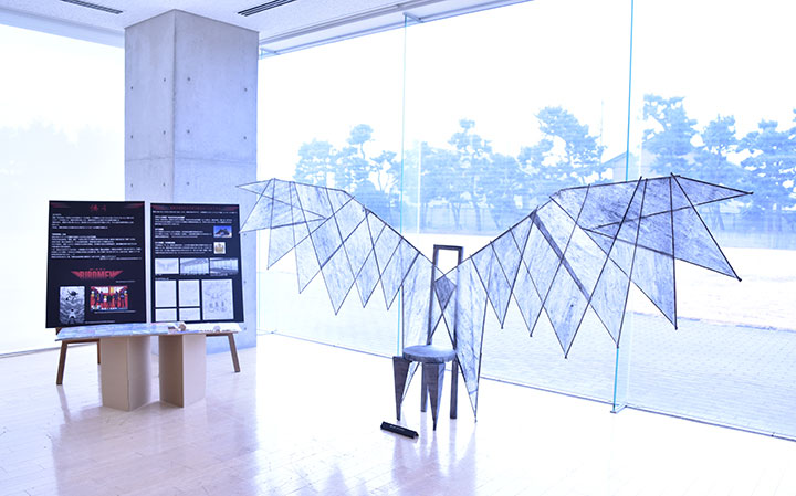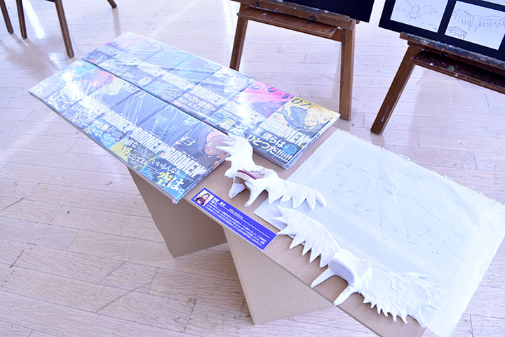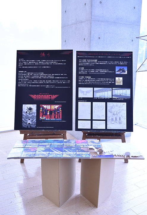 「BIRDMEN」という漫画を読むための空間をテーマに制作しました。この漫画をより多くの人に知ってもらいたいという想いからこのテーマを設定しました。漫画から読み取ったことを自分の中で噛み砕き、そこに自分の世界を落とし込みました。
