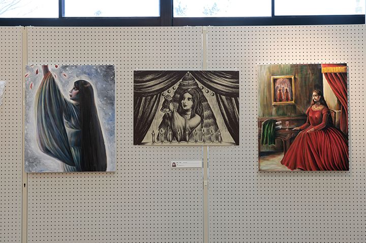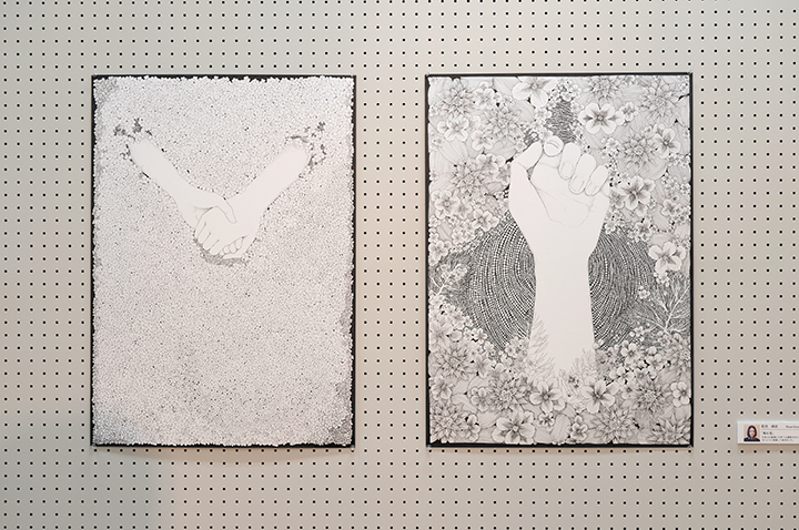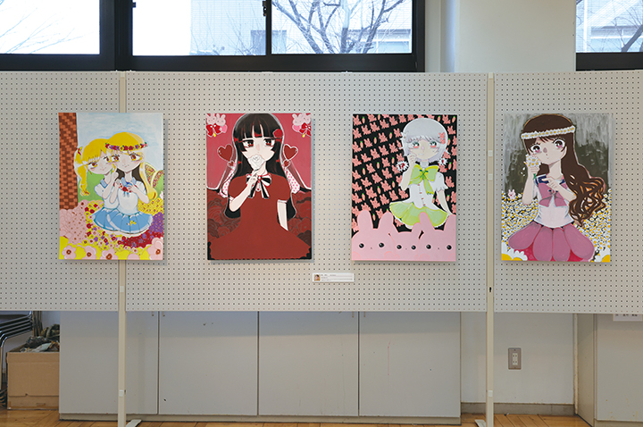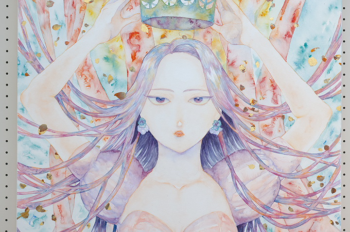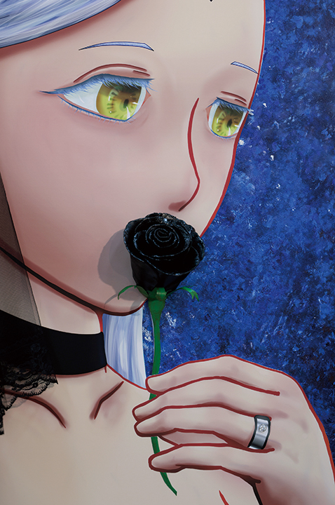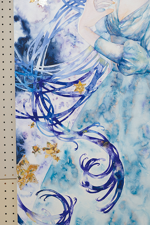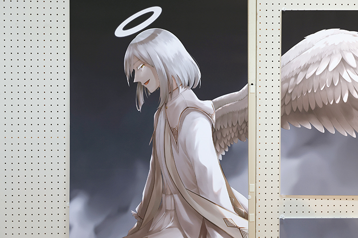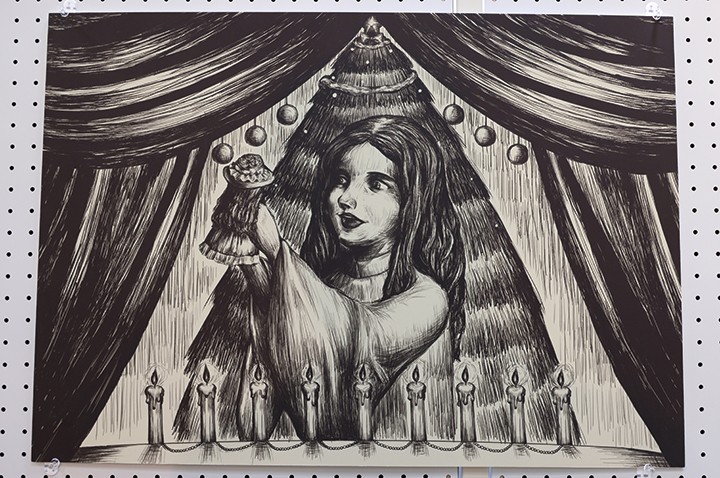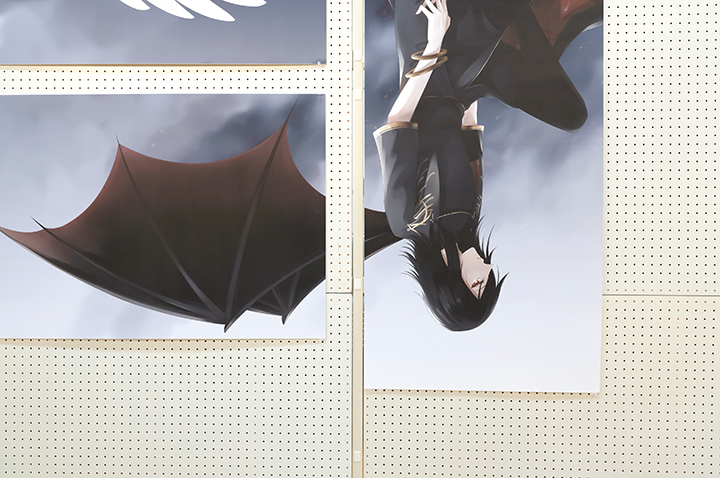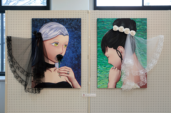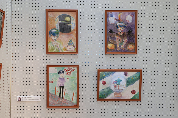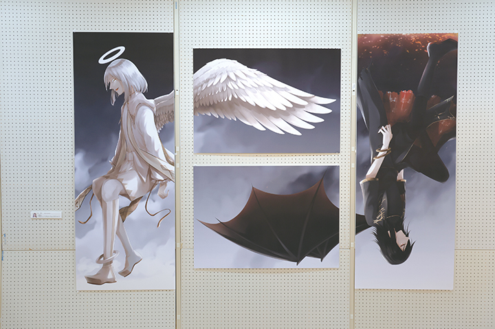 天使と悪魔を描きました。近くで見ても綺麗に見えるように細かいところまで描き込んでいます。キャラクターが対照的に見えるようキャンバスを上下反転させたり、色の配色などに気を付けながら制作しました。