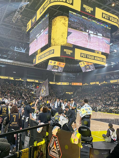 会場にはたくさんの人がいて、試合が始まる前からDJやチアリーダーたちのパフォーマンスなどがあり大盛り上がりでした。