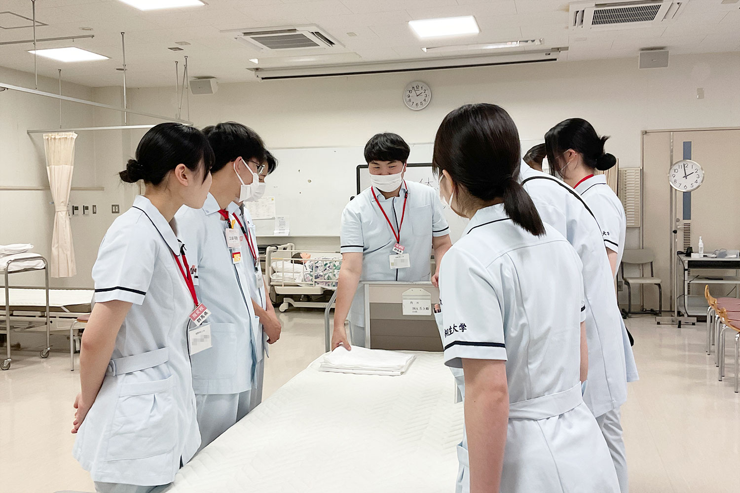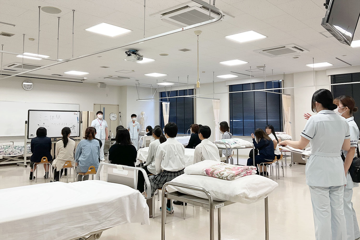 ミニ体験では、実際に大学に入学してから1番初めに習うベッドメイキングのシーツ交換を行いました。